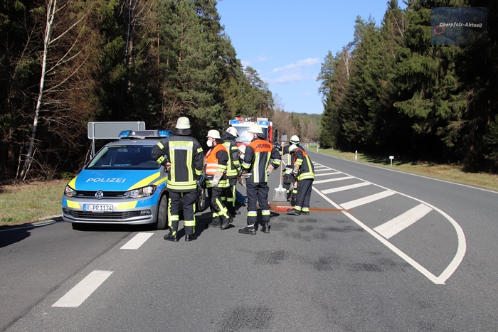 Zur Absicherung und Fahrbahnreinigung waren die Feuerwehren aus Speinshart und Eschenbach alarmiert worden. Auch ein Rettungswagen war an der Unfallstelle.