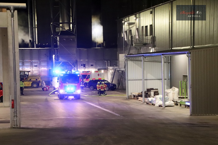 Aus einer Maschine drangen im Bereich der Förderschnecke Flammen. Diese konnten durch die Mitarbeiter zunächst eingedämmt werden. Mit dem Alarmstichwort „Brand Industrie B4“ wurden daraufhin mehrere Einsatzkräfte von Feuerwehr, BRK und Polizei an die Einsatzstelle alarmiert.