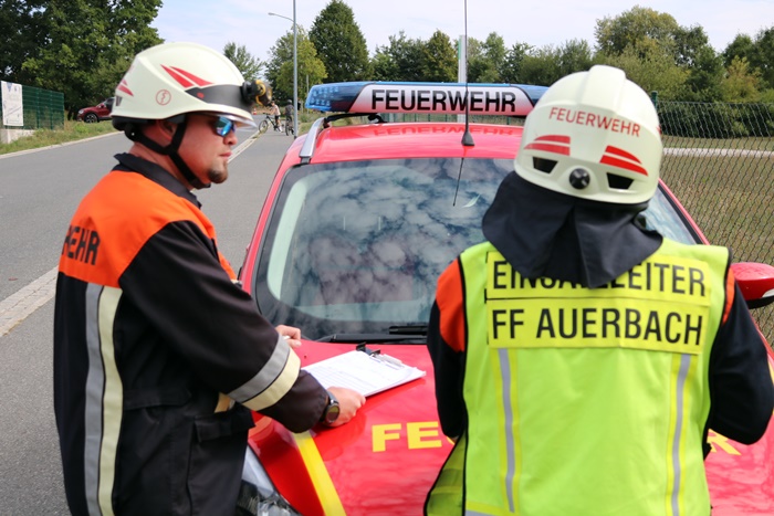 Auerbach. „Verkehrsunfall mit zwei Fahrzeugen“, so lautete zunächst die die Einsatzmeldung von Übungsleiter Kreisbrandinspektor Hans Sperber am Samstagnachmittag für die Feuerwehr Auerbach. Nach Eintreffen von Kreisbrandmeister Michael Schmidt und des Einsatzleiters Sven Zocher in der Alpostraße, stellten diese austretende Gefahrstoffe am Unfallbeteiligten LKW fest. Sie ließen den Gefahrenbereich absperren.