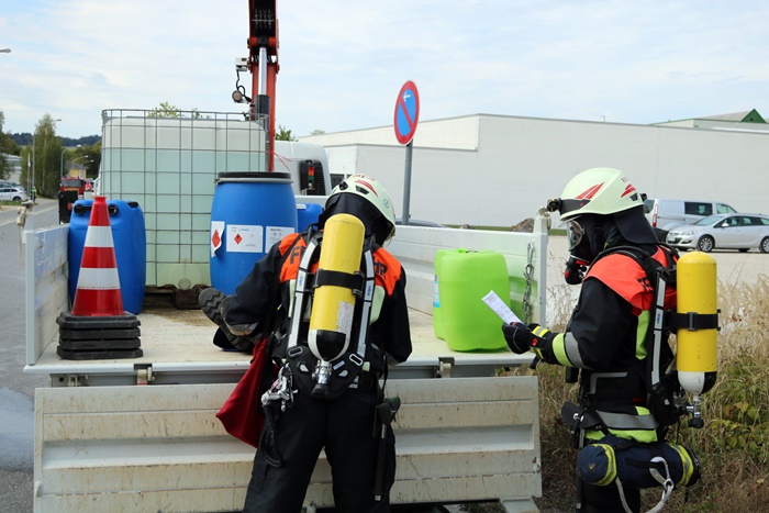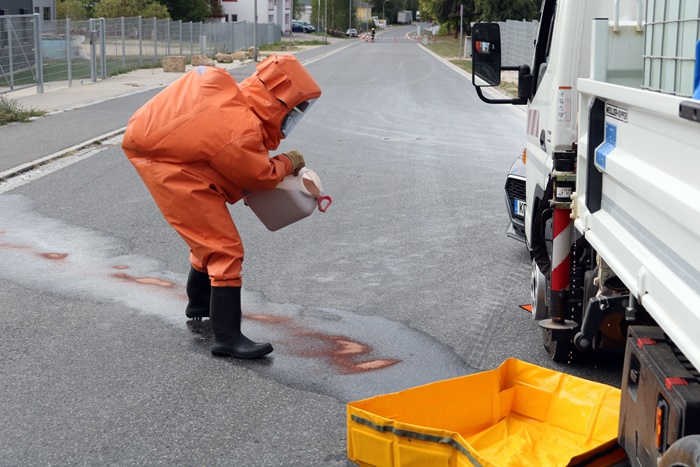 Auch die Einsatzleitung, die zwischenzeitlich am Mannschaftstransportwagen der Feuerwehr Neuhaus eingerichtet wurde, kam entsprechend ins Schwitzen. Der zweite Übungsleiter Markus Held, von der Feuerwehr Auerbach, hatte im Vorfeld die Ladefläche des LKW, sowie den Kofferraum des PKW mit verschiedensten angenommenen Gefahrgutflüssigkeiten in Behältern vollgepackt. Darunter mehrere 50 Liter Fässer, sowie ein 1.000 Liter fassender Behälter aus dem aufgrund des Unfalls Flüssigkeit austrat. Das Erkunden der insgesamt 7 verschiedenen Gefahrgutstoffe, deren Sicherung in Faltbehälter und das Abdichten der Leckage erforderte ordentlich Manpower. Insgesamt kamen so 12 Chemikalienschutzanzugträger mit dem Anzug der höchsten Schutzklasse, der sogenannten Form 3, zum Einsatz.