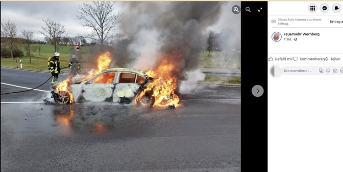 Wernberg-Köblitz. Am gestrigen Dienstag, den 27.12.2022, gegen 11:45 Uhr, fing ein BMW auf der BAB A6, Fahrtrichtung Heilbronn, an zu qualmen. Der Fahrzeugführer, ein 27jähriger tschechischer Staatsangehöriger schaffte es gerade noch, sein Fahrzeug in den Parkplatz Wittschauer-Höhe einzufahren, bevor Flammen aus dem Motorraum schlugen. Er konnte sich unverletzt aus dem Fahrzeug retten, bevor dieses vollständig in Brand stand. Das Feuer wurde durch die Feuerwehr Wernberg-Köblitz gelöscht, es entstand kein Personenschaden. Der Sachschaden beläuft sich auf ca. 27 000 Euro. Brandursache war vermutlich ein technischer Defekt.