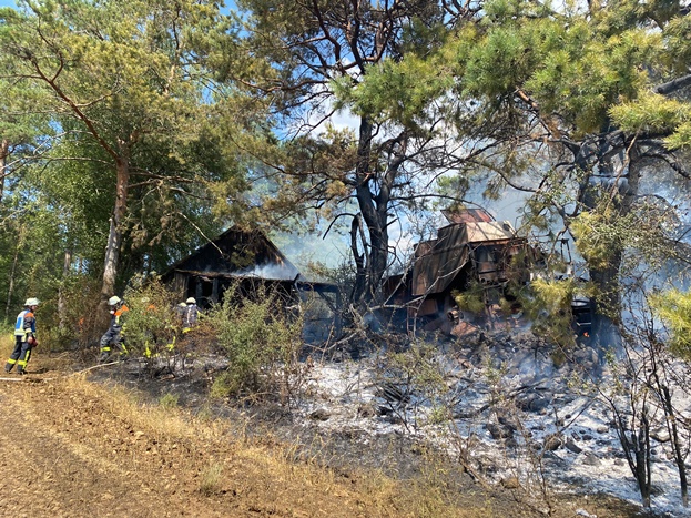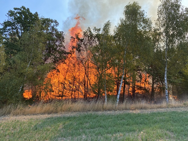 Als die ersten Einsatzkräfte an der Einsatzstelle angekommen sind, fanden sie mehrere Brandstellen vor. Bei Erntearbeiten ist ein Feld in Brand geraten und durch den drehenden Wind wurde ein angrenzendes Waldstück mit in Brand gesetzt. In diesem Waldstück befand sich ein älteres landwirtschaftliches Fahrzeug, sowie mehrere Strohballen und eine kleine Scheune mit einem Anbau. Das Fahrzeug, sowie die Strohballen und der Anbau wurden durch den Brand in Leidenschaft gezogen.