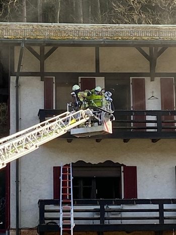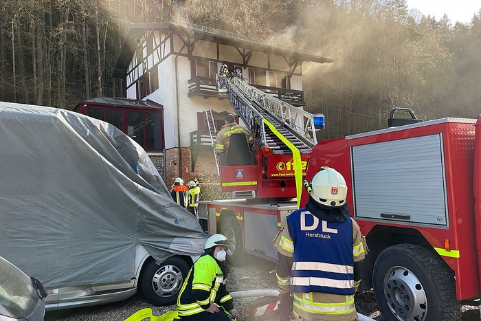 Daraufhin rückte ein Großaufgebot an Rettungskräften aus der Oberpfalz und Mittelfranken nach Unterhirschbach aus. Der Brandort befand sich im ersten Obergeschoss des Gebäudes. Deshalb verschafften sich die Feuerwehrmänner mit schwerem Atemschutz über den Balkon, die obenliegende Haustür und über die Drehleiter der Feuerwehr Hersbruck Zutritt zum Gebäude.